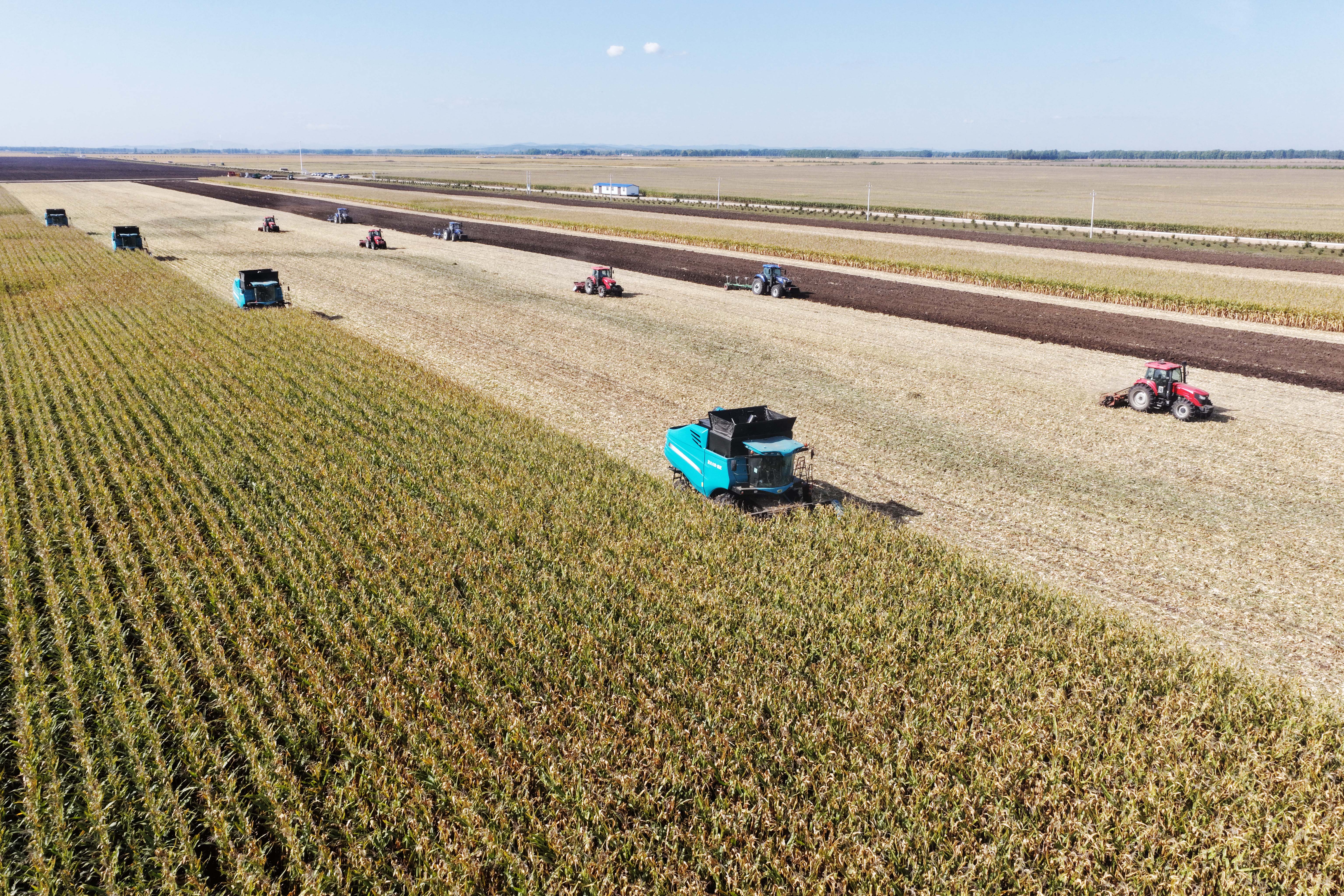 2025年9月23日,在位于雙鴨山市的黑龍江北大荒農(nóng)業(yè)股份有限公司友誼分公司一旱田地塊,大型農(nóng)業(yè)機(jī)械在進(jìn)行玉米收獲作業(yè)(無人機(jī)照片)。新華社記者 王松 攝