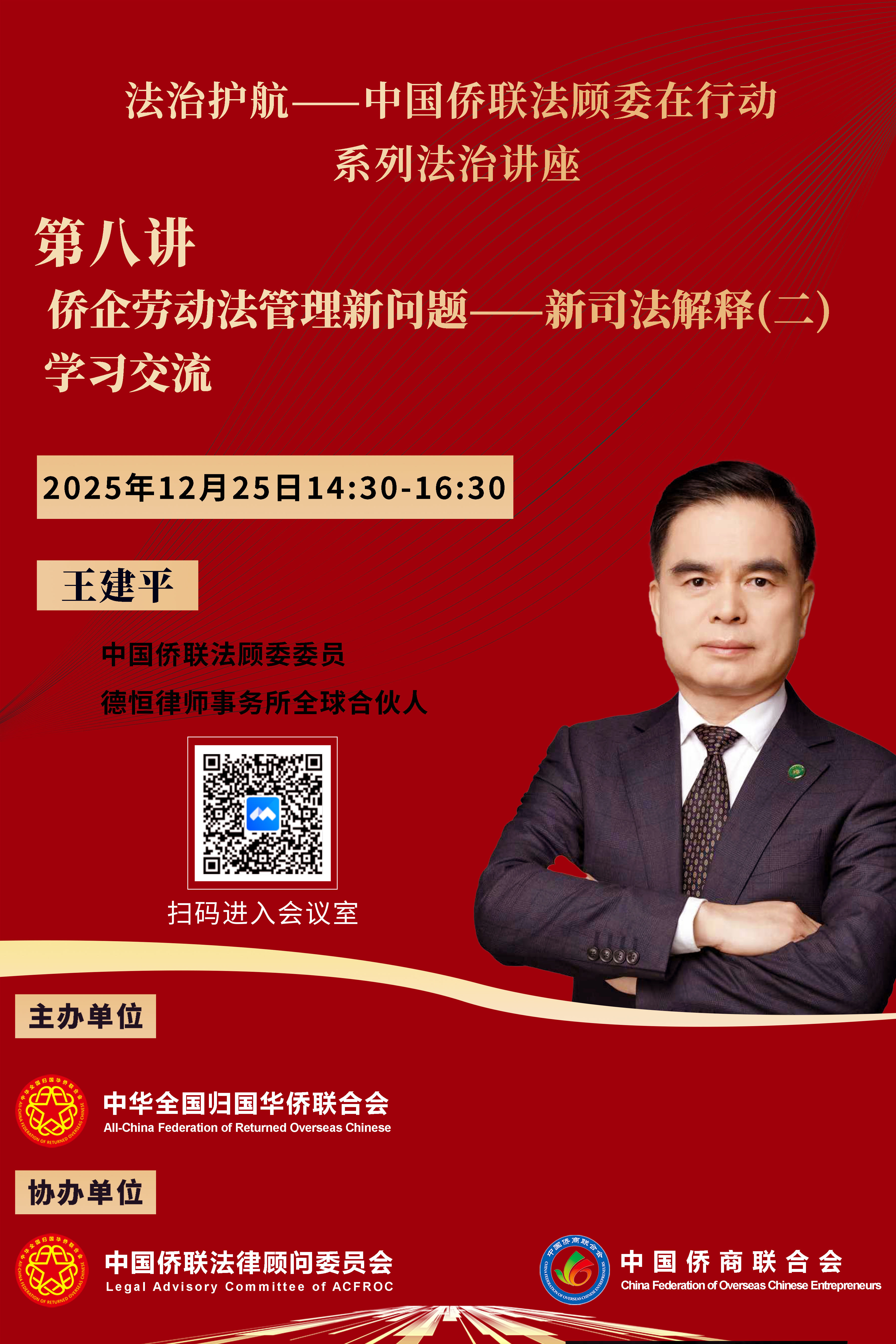 第八講將于12月25日(周四)14:30開播,由中國僑聯(lián)法顧委行政勞動專委會主任、德恒律師事務所全球合伙人王建平律師主講,題目是《僑企勞動法管理新問題——新司法解釋(二)學習交流》。聽課鏈接參見下方海報。